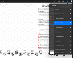 I highly recommend copying the hex-grid layer, moving the copied layer below the colouring layers, then using Auto-Select tool and Fill to quickly colour your landscape hexes as you generate your Realm; then use invert-select and the eraser to clear away the superfluous grid lines.